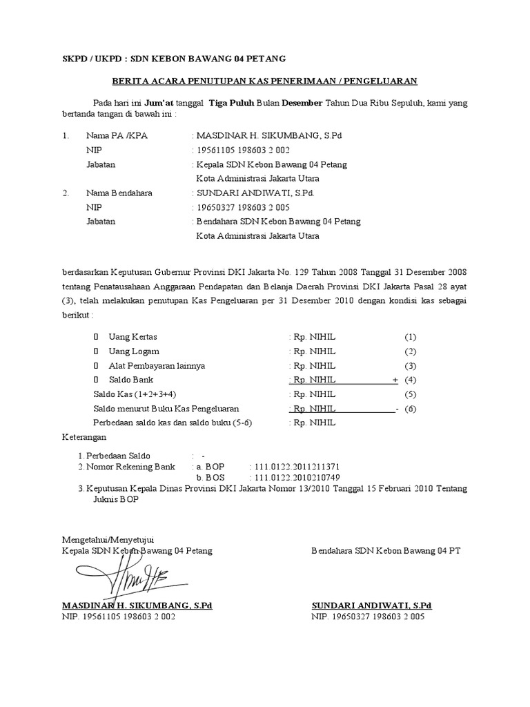 Berita acara pemeriksaan kas, regiter dan penutupan kas. Dokumen yang disiapkan adalah buku kas umum. Format bos k3 bulan : Sehingga dengan adanya form tersebut, maka sepatutnya penutupan buku kas umum dibuatkan dalam lembaran halaman terpisah. ,00 kepala madrasah ,00 ,00 ,00 ,00 drs. Istilah kas atau yang juga sering ditulis cash sudah seringkali kita dengar, familiar ditelinga yang memiliki arti tunai atau dibayar secara langsung menggunakan uang. Dulu bendahara desa) baik penerimaan dan pengeluaran yang bersifat tunai.untuk sobat desa yang ingin mengetahui nasib bendahara desa dan kaur keuangan, silahkan baca tautan itu. Buku pembantu :kas tunai c. Jumlah tanggal uraian pengeluaran bagian bulan no. Pembukuan dilaksanakan berdasarkan asas bruto 5. Contoh lain adalah berita acara pemeriksaan atau penutpan kas berita acara penutupan buku kas. Sehingga pada penutupan kas , pencatatan di buku kas umum akan diuji ketelitiannya dengan memperbandingkan dengan catatan di buku pembantu kas. Inilah pembahasan lengkap terkait contoh buku kas umum bendahara pengeluaran pembantu.