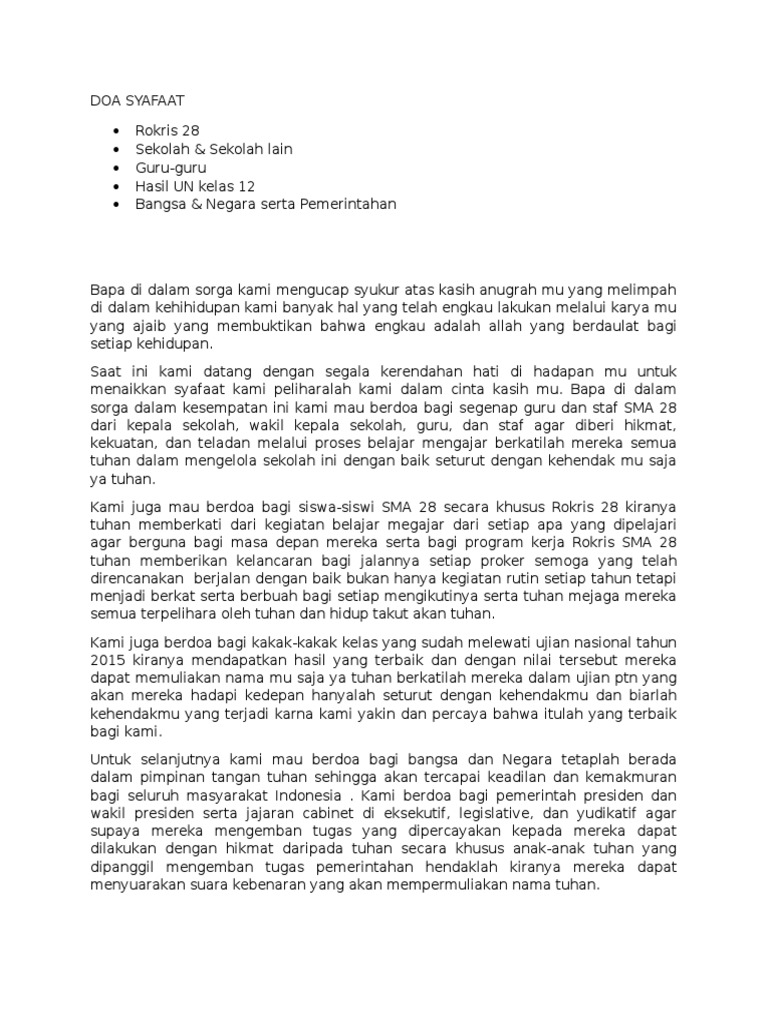 June 16, 2018 in pokok doa no comments 2215. Dalam ibadah sekolah minggu yang dipimpin oleh seorang guru sekolah minggu maka pada saat berdoa baik mulai awal, doa syafaat sampai doa penutup dilakukan oleh penyampai cerita alkitab di ikuti anak anak. Doa syafaat juga berarti 'mendoakan orang lain'. Contoh doa syafaat ibadah minggu kristen protestan. Berdoa untuk kebaktian dan pelayanan hari ini.